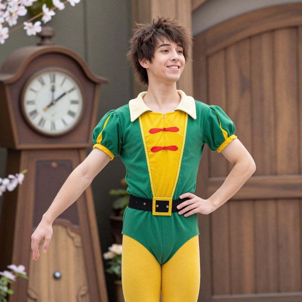 Photograph of a young man with spiky brown hair, smiling, standing outdoors. He wears a green and yellow costume with a white collar, red toggle buttons, black belt, and yellow pants. His right hand is on his hip while his left arm is relaxed. Background includes a wooden clock with a white face and a wooden door. Pink cherry blossoms are visible in the top left corner. The costume resembles a classic Peter Pan outfit. The scene is brightly lit, emphasizing the vibrant colors of the costume and the natural wood tones of the background.