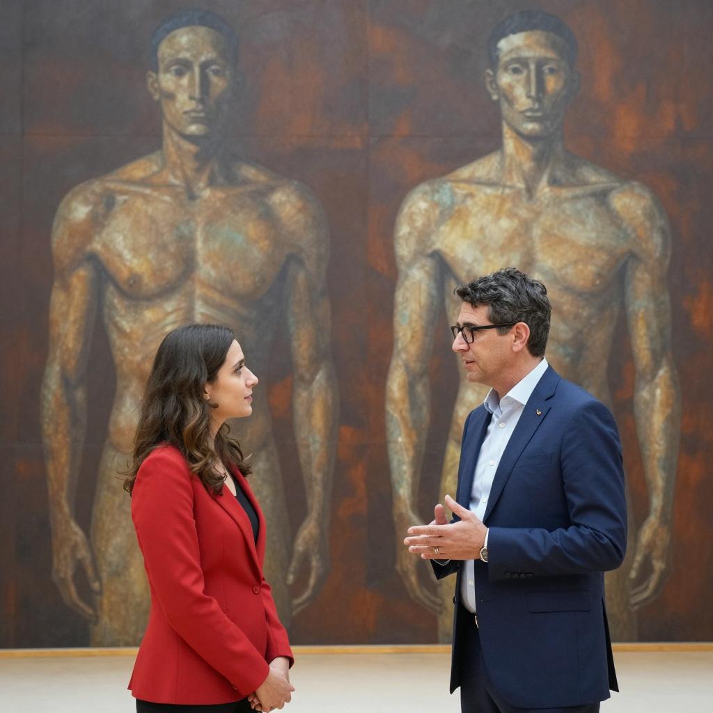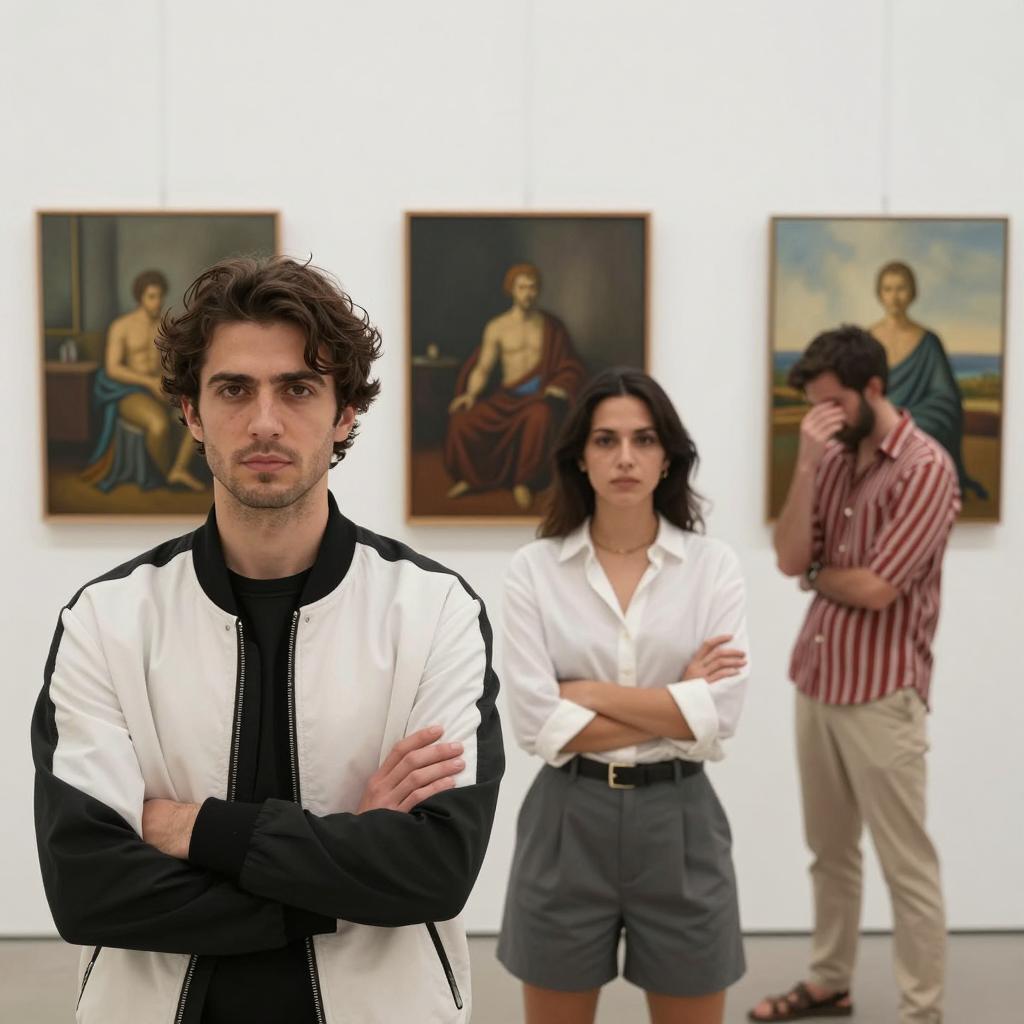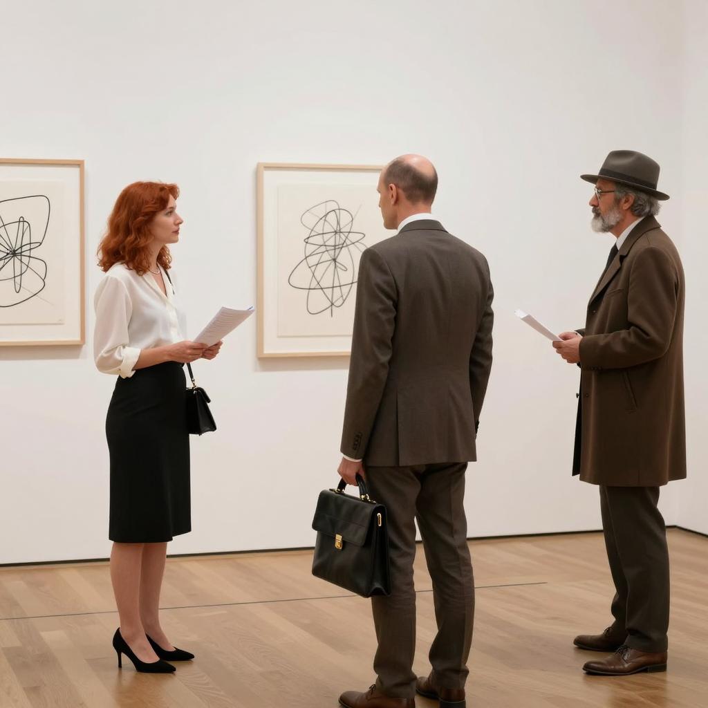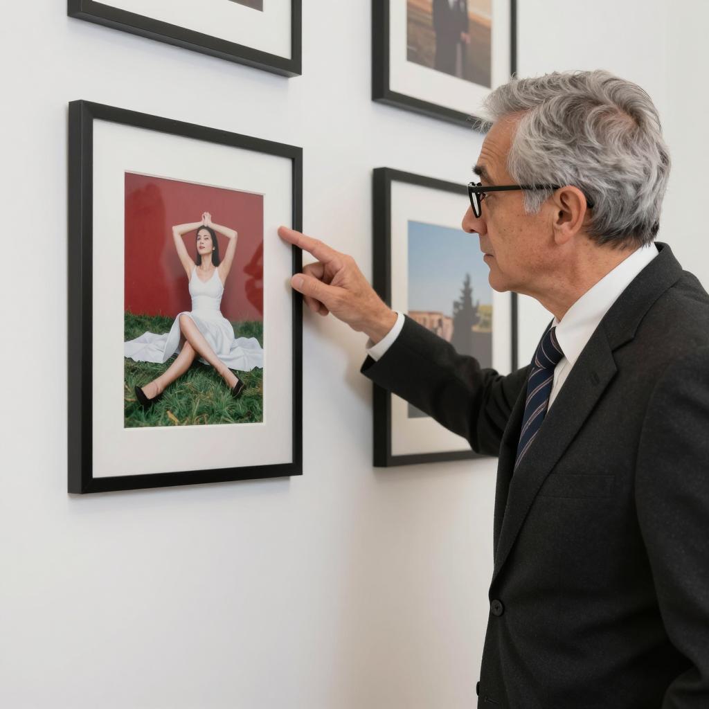 Middle-aged man with gray hair, black-framed glasses, black suit, white shirt, and striped tie, leans on wall, pointing at framed photograph. Photograph shows woman in white dress, red background, lying on grass, arms above head. Wall has multiple small framed pictures, ured surface. Man's right hand on frame, left hand on wall.