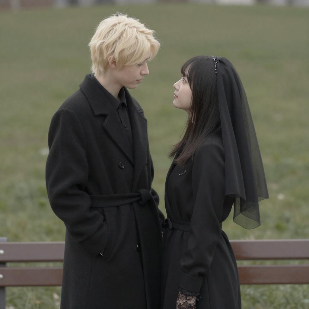 A stylish young couple standing outdoors in a park, engaging in intimate eye contact. The blonde individual wears a black belted coat, while the dark-haired person is dressed in a black outfit with a sheer black veil and lace gloves. They stand near a wooden bench with blurred grass in the background.