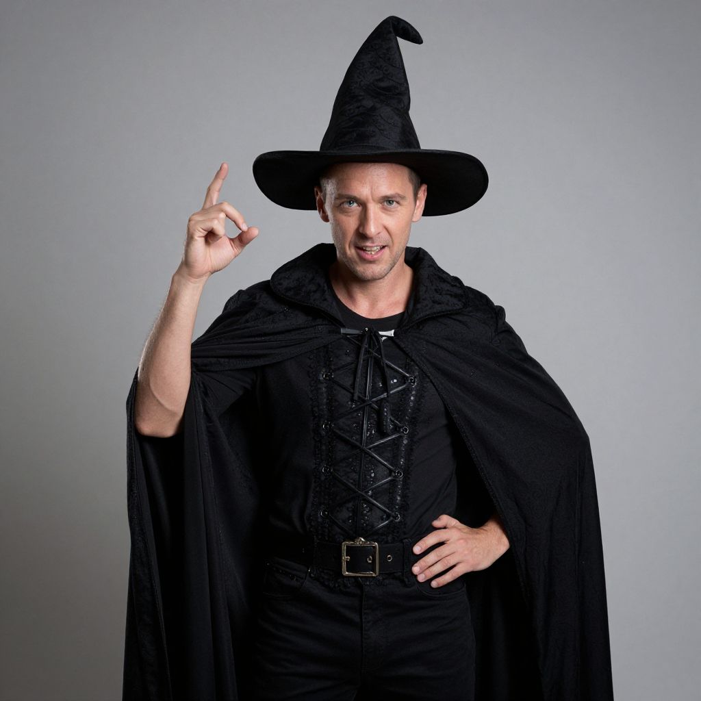 Photograph of a white man with short brown hair and a beard, wearing a black witch hat and black medieval-style cloak with a corseted black shirt underneath. He is pointing upward with his right index finger, while his left hand rests on his hip. His expression is serious and slightly menacing. The background is a plain, light gray gradient, and the lighting is even, highlighting the textures of the fabric and his facial features. The overall style is reminiscent of a Halloween costume.