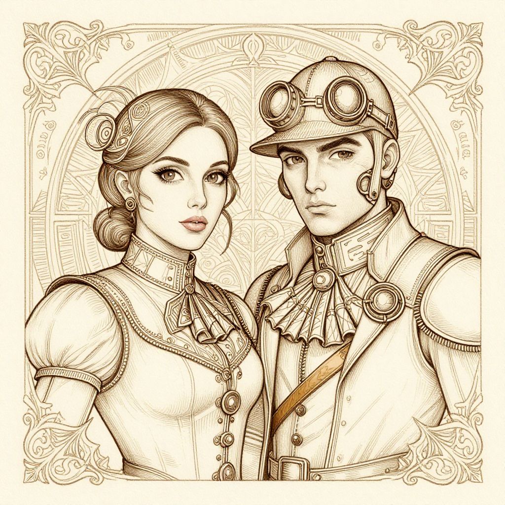 Detailed black-and-white illustration of a Victorian-style woman with a bun and a steampunk man with goggles and a cap, both adorned in intricate,