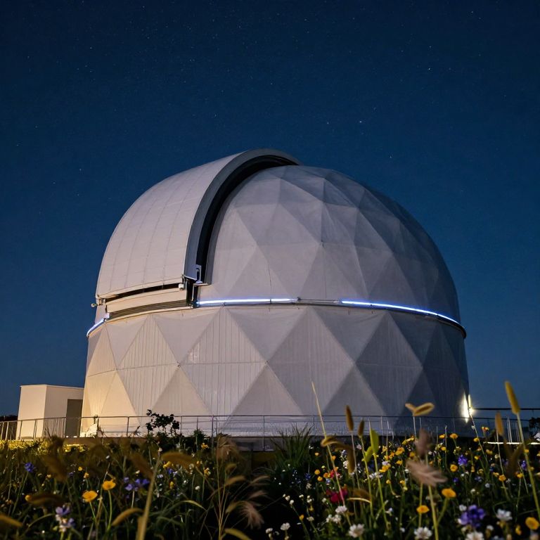 A night scene showcasing a geodome observatory under a starry sky, intricate structural details illuminated by soft LED lights, surrounding wildflowers gently swaying in the breeze, photo-realistic rendering highlighting nocturnal tranquility and innovation.