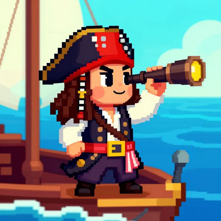 Production toddler privateer hero carrying pistol in right hand and holding lantern in front of him walking deep into a cave; creepy background; pixel art, retro, UHD,