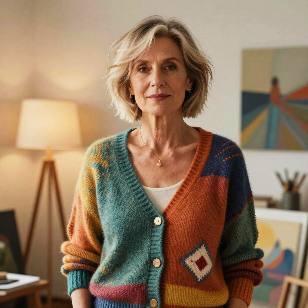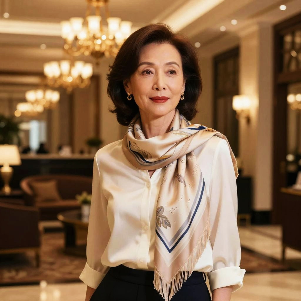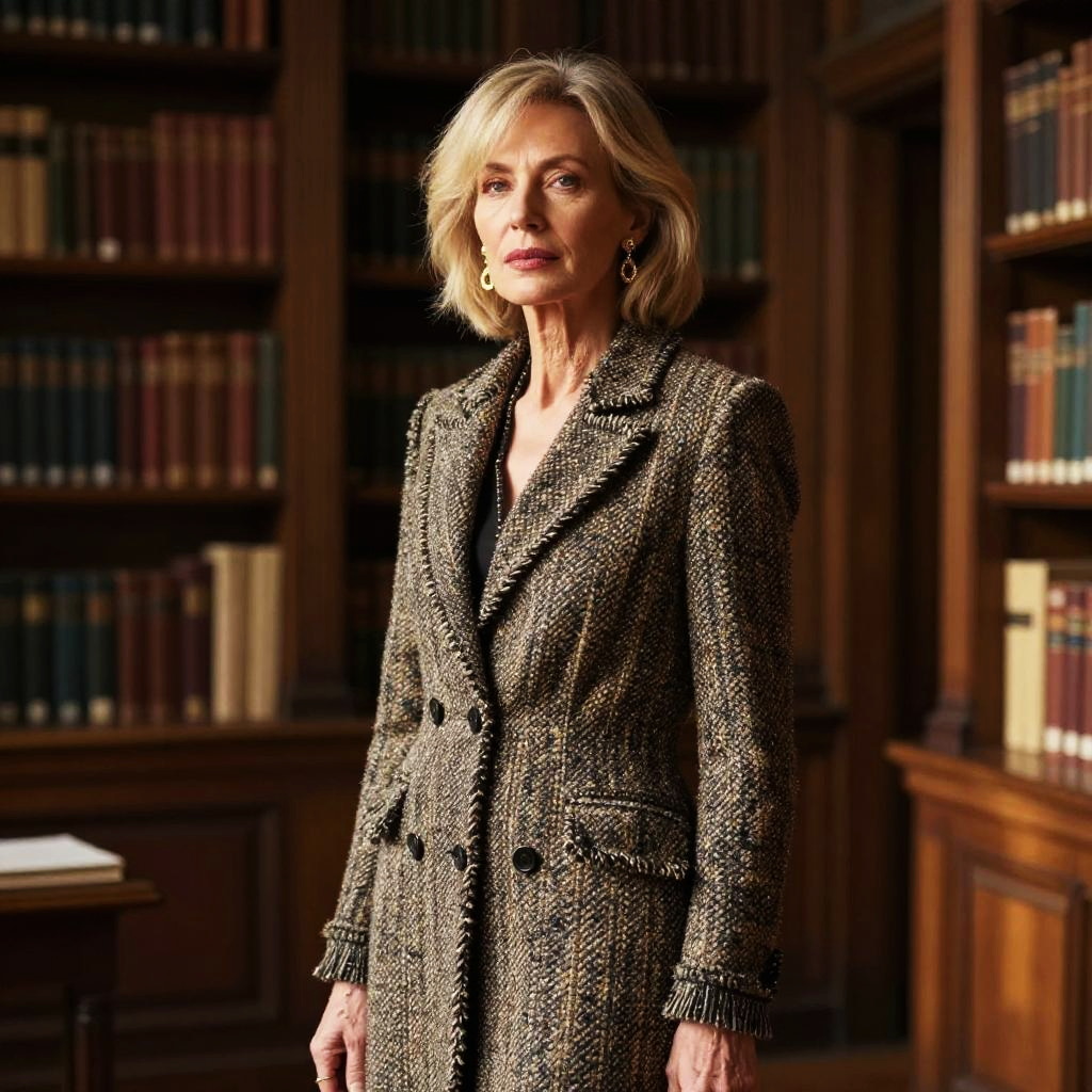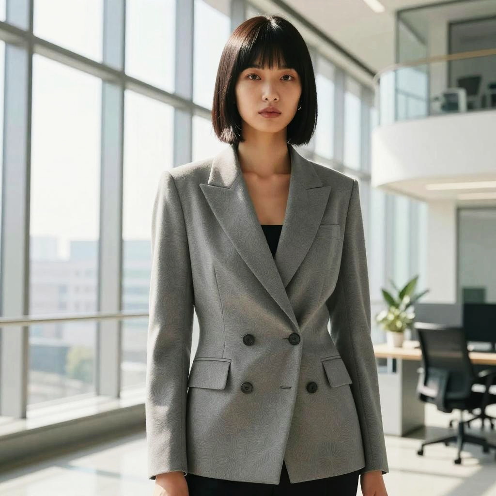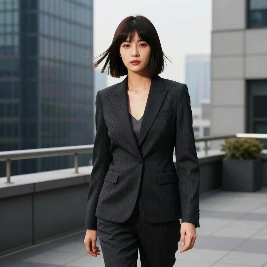 Peekaboo Fringe hairstyle on elegant female singer, wearing sparkling sequin gown, in theater stage, captured in fashion editorial style with bright glossy spotlight highlights.
