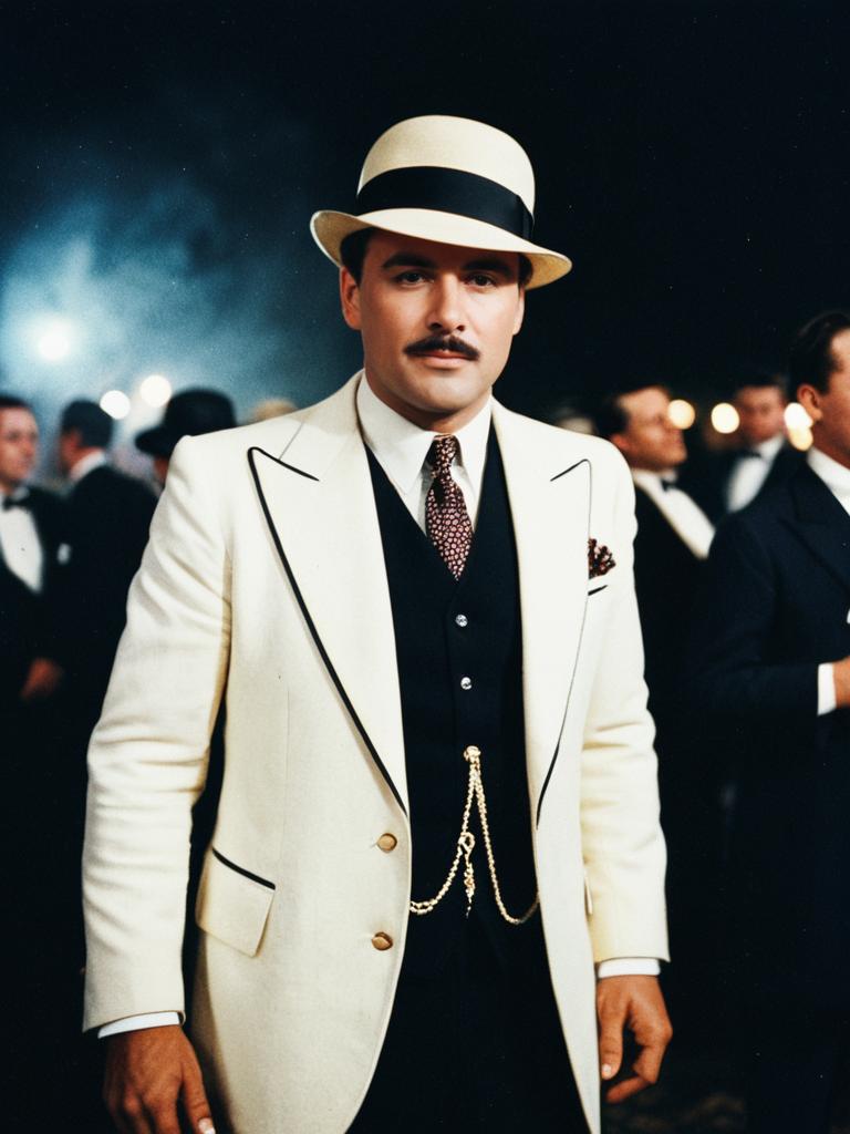 Man in Gatsby Party Costume, cinematic realism, dramatic editorial photo