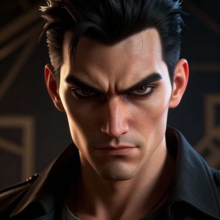 Gru render featuring a dynamic 3D portrait of a sly anti-hero with sharp angular features and deep-set eyes, illuminated by dramatic lighting with strong contrast, detailed skin textures and stylized background elements suggesting espionage themes.