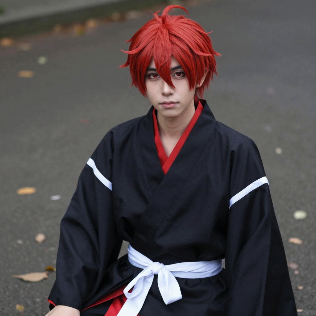 Photograph of a young person with red, spiky hair, wearing a black kimono with white stripes and a white belt, sitting on an asphalt