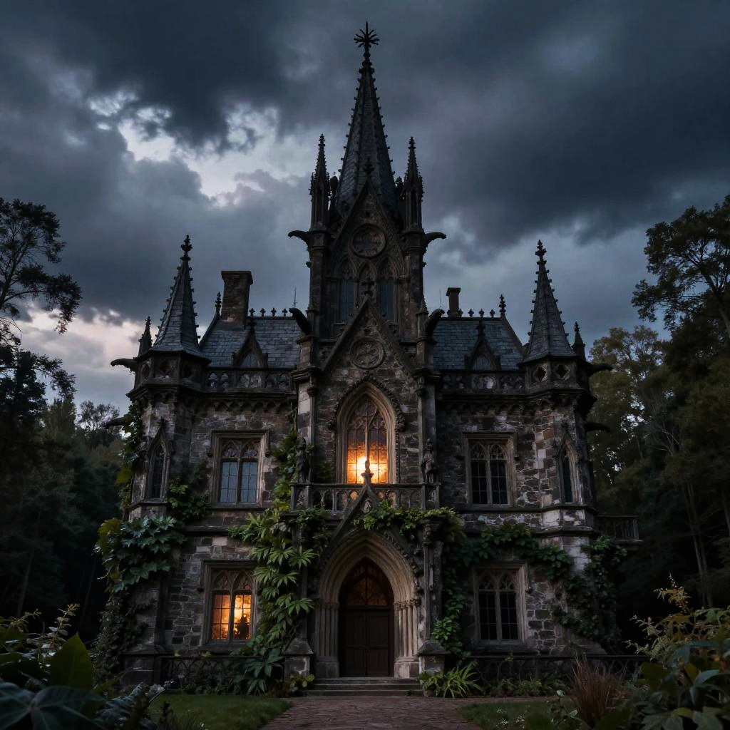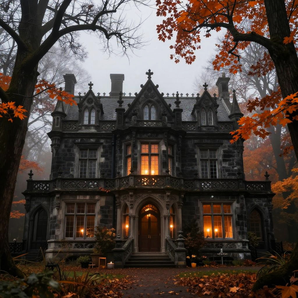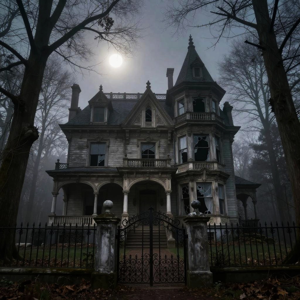 Mysterious, eerie, Victorian-style haunted house with ornate details, overgrown trees, and a glowing moon behind fog, surrounded by an iron fence