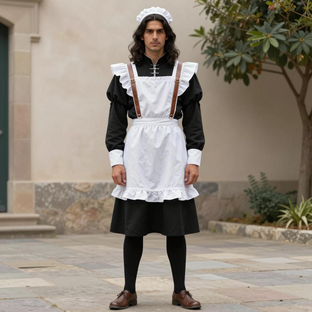 Edwardian maid costume, photograph of a woman in a traditional French maid outfit, standing in front of a plain beige wall, arched window in background, wearing black shoes, white headband, black and white dress with lace trim, short sleeves, apron, neutral expression, studio lighting, centered composition, realistic style