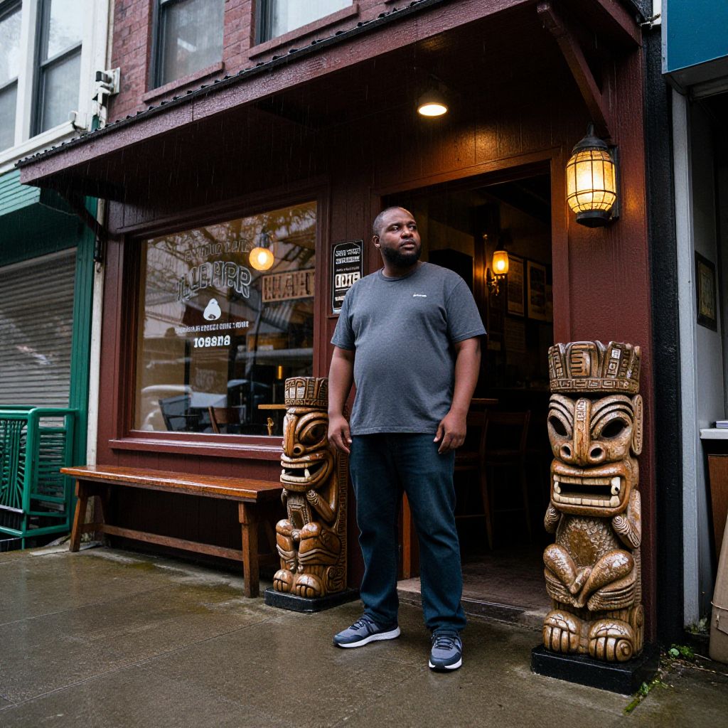 Wide-Angle Photography an american man stands outside of a tiki bar in the city on a rainy morning and waits impatiently for it to open,