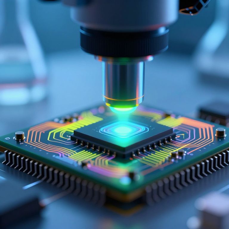 Chip under microscope, extreme macro shot of a microelectronic chip showing transistors and nanowires illuminated with neon colors, scientific atmosphere with blurred laboratory background, digital art style emphasizing precision and technology
