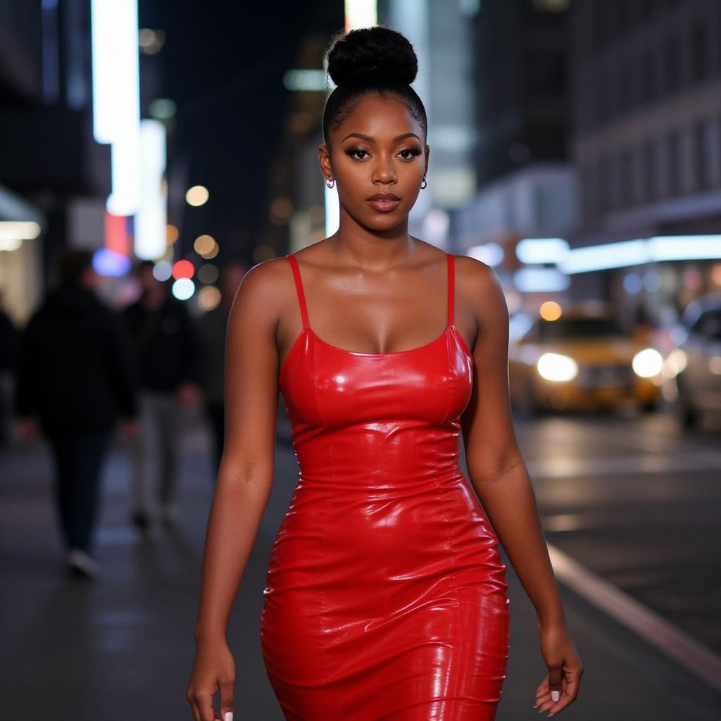 Photograph of a confident Black woman with dark skin and a sleek, high bun, walking down a neon-lit city street at night. She wears a shiny, form-fitting red latex dress with thin straps, and small hoop earrings. The background shows blurred city lights, people, and a mix of dark and brightly lit buildings, creating a vibrant urban atmosphere.