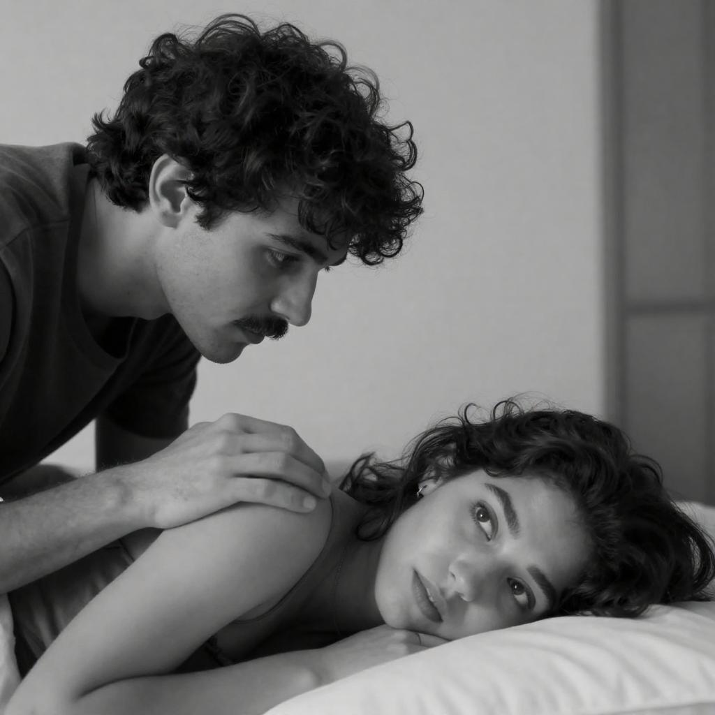 A male artist wearing a red beret and white shirt is painting a portrait of a woman in a red dress lying on a green-covered bed. The artist stands in front of an easel with a palette and brushes nearby in a bright studio with wooden floors and green curtains framing a large window.