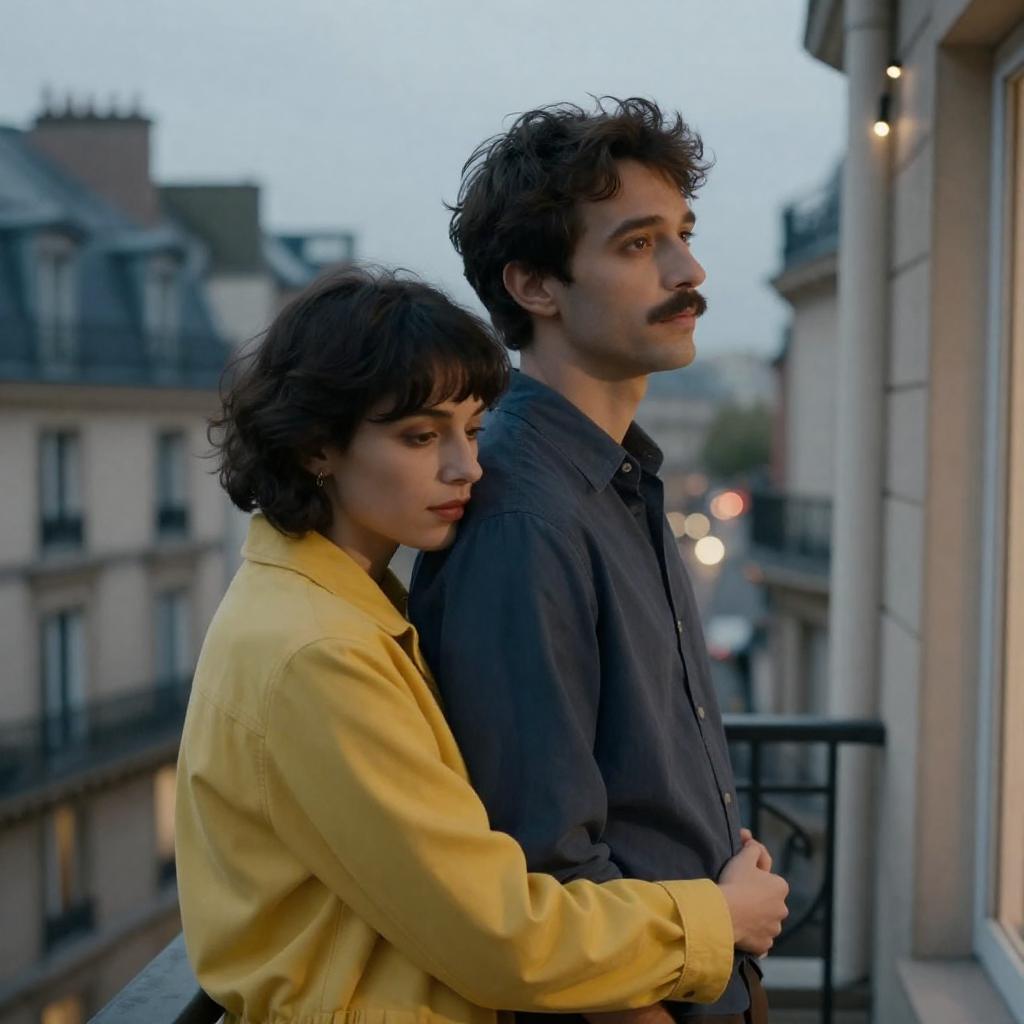Art studio scene. Male artist with mustache, red beret, white shirt, painting woman in red dress, arm raised. Woman painting reclining on green bed, arm behind head. Artist's palette, brushes on table. Large window, green curtains, wooden floor.