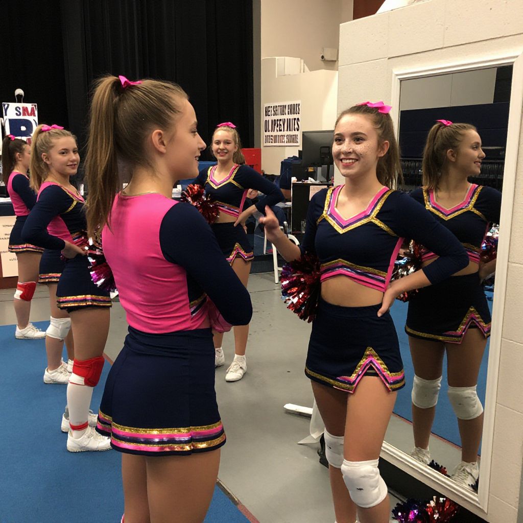 A candid moment of cheerleaders in their cheer practice uniforms and costumes during a halftime rehearsal at a high school event. The girls are dressed in navy-blue and pink uniforms with gold trim, wearing fitted cheer shirts, matching shorts, and red and white knee pads. One girl has freckles across her nose and a wide grin, holding a foam baton while standing by a mirror. The setting includes a decorated stage with cheer signs and a small audience of students.