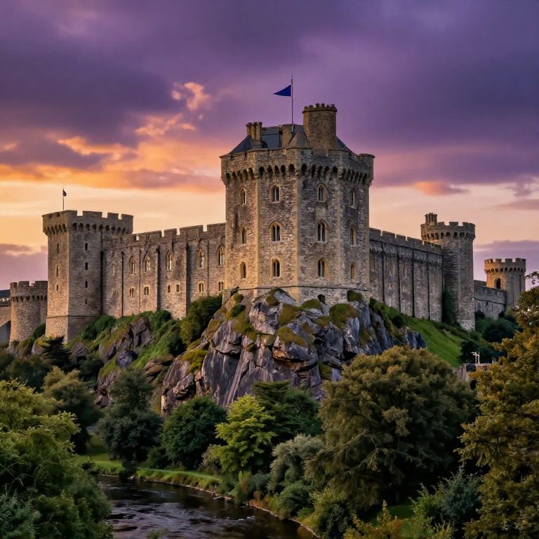 Inglaterra medieval castle perched atop a rocky hill, surrounded by lush forests and winding rivers, dramatic twilight sky with purple and orange hues, detailed stone architecture with flags waving in the gentle breeze, fantasy historic atmosphere.