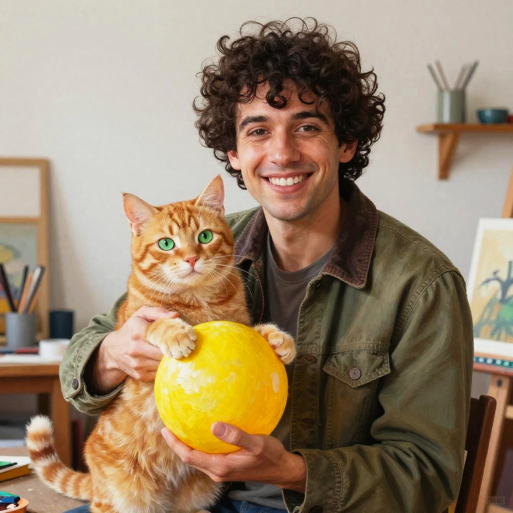 Curly-haired man smiling, holding orange tabby cat with green eyes and yellow ball, in brightly lit art studio.