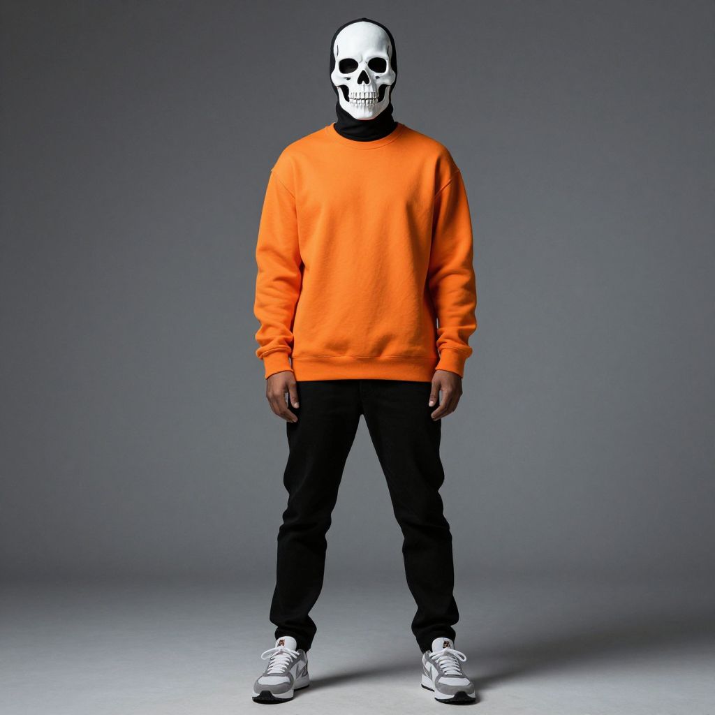 Man in Orange Sweatshirt with Skull Mask