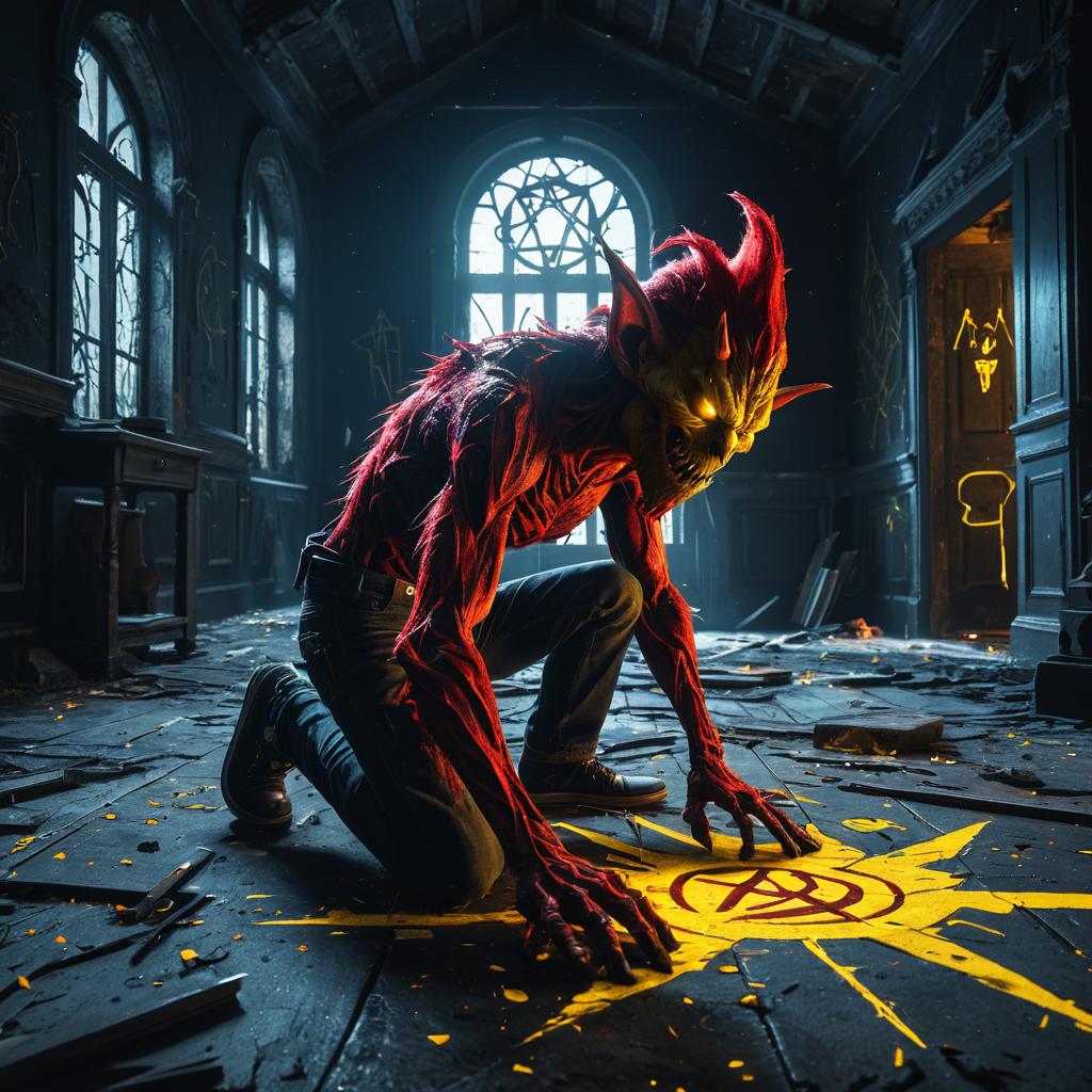 A red goblin with glowing eyes is depicted inside a dark, abandoned, and destroyed haunted house. The creature is kneeling on the floor, seemingly being drawn into a bright yellow magical sigil painted on the ground. The setting features old, broken windows and scattered debris, creating a spooky and cinematic atmosphere. The image is in high resolution with vivid, colorful paint effects.