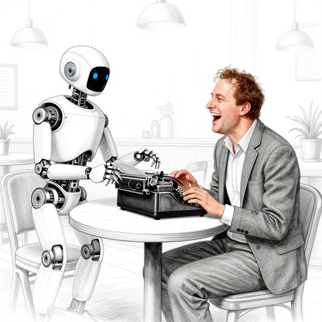 A vividly colored digital illustration depicts a laughing man in a gray suit sitting at a white round table, typing on a black typewriter. Opposite him is a white robotic humanoid with black eyes and joints, also engaged with the typewriter. The man's short, curly brown hair and joyful expression contrast with the robot's sleek, mechanical appearance. The background is minimalistic with faint line drawings of plants, emphasizing the focus on the characters. The image combines realism in the man's attire and expression with a cartoon-like, high-contrast style for the robot.