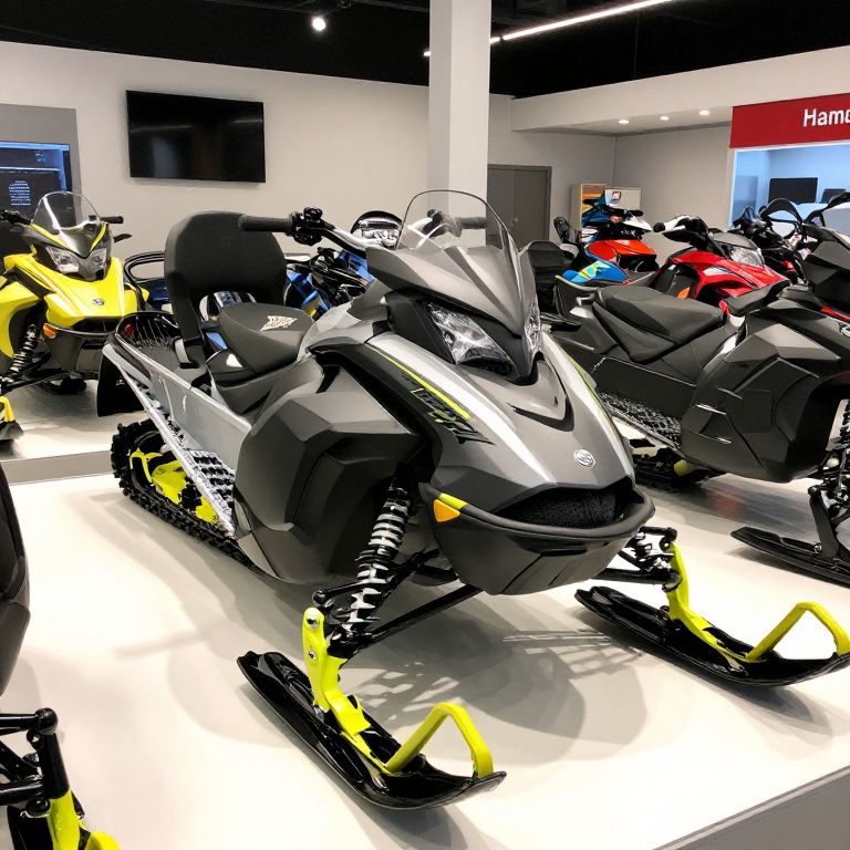 Snowmobile prominently displayed in a showroom, featuring a sleek black and gray design with vibrant yellow accents, positioned centrally among other off-road vehicles in Hamburg, New York.