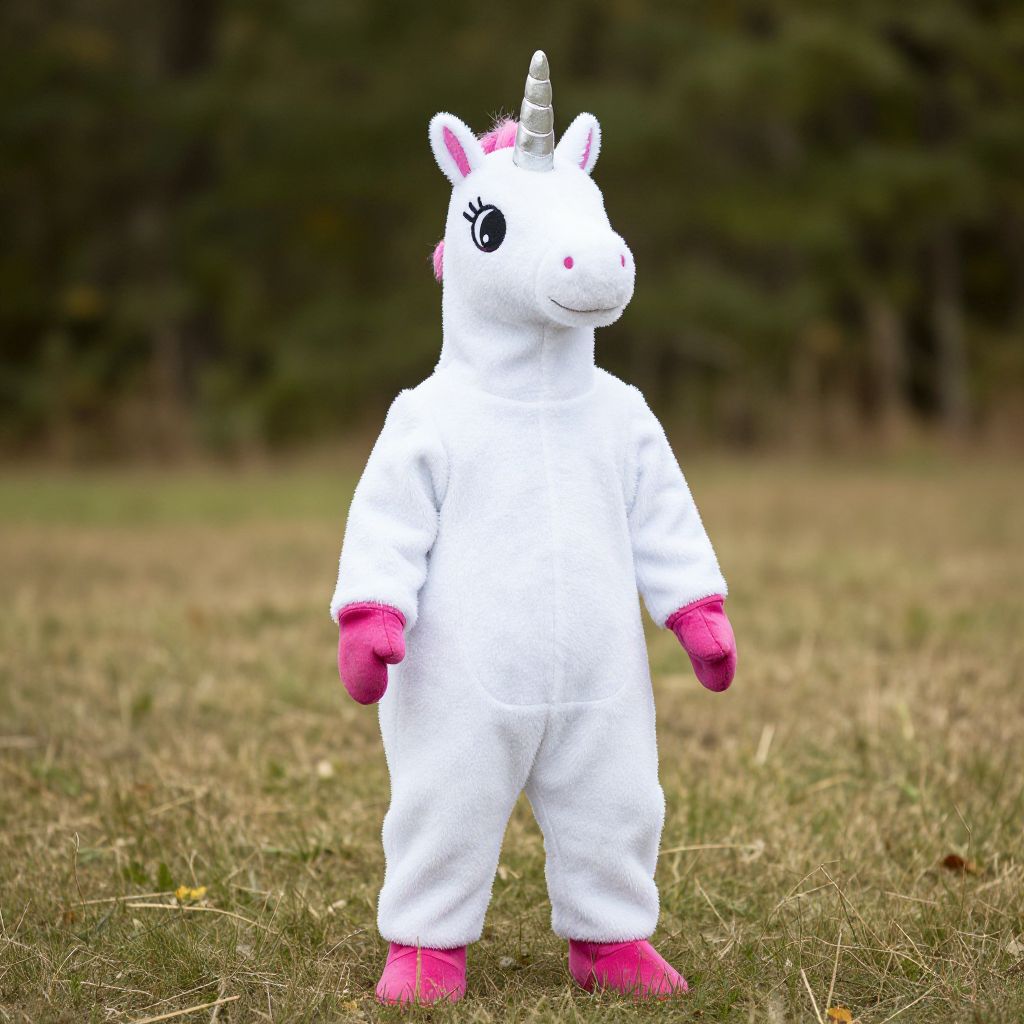 "Unicorn Costume Infant, in a white unicorn costume standing in a field"