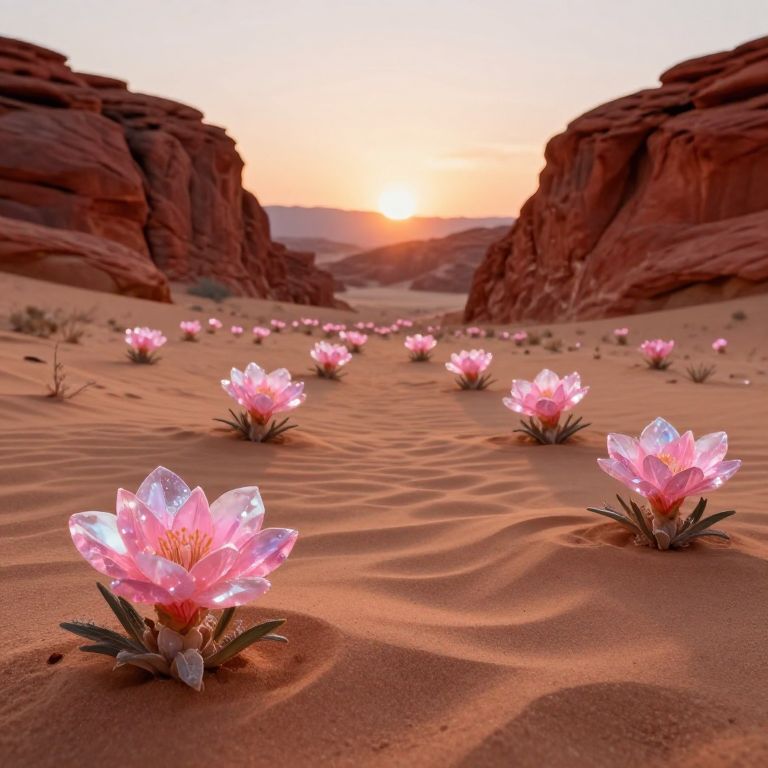 Vibrant crystalline flowers bloom in a Martian desert, their pink hues shimmering under the setting sun as they harmonically resonate with every step along the sandy path between towering red rock formations.