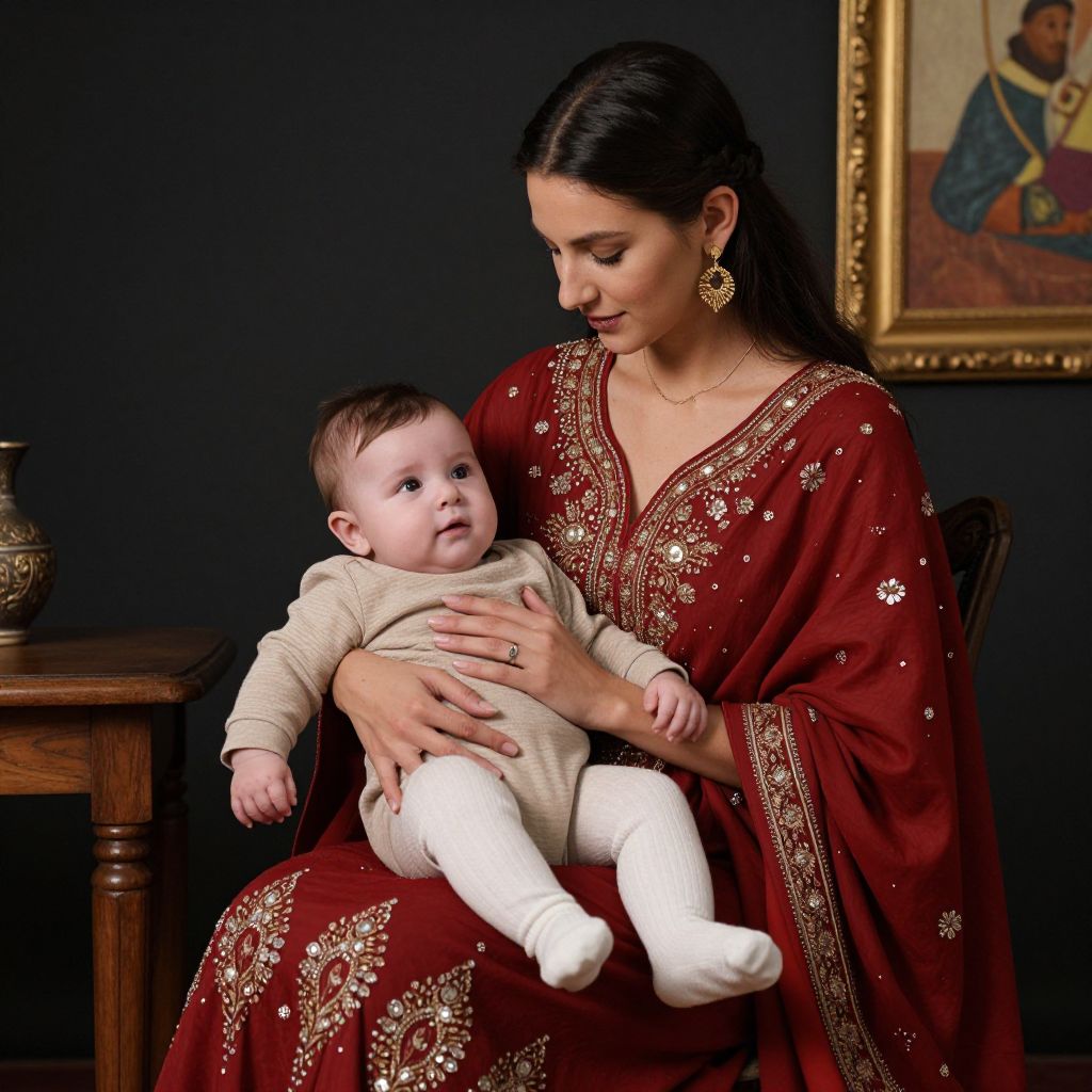 Woman in ornate red attire tenderly holds a baby dressed in beige, seated on her lap against a dark background with a wooden table and framed artwork visible to the side.