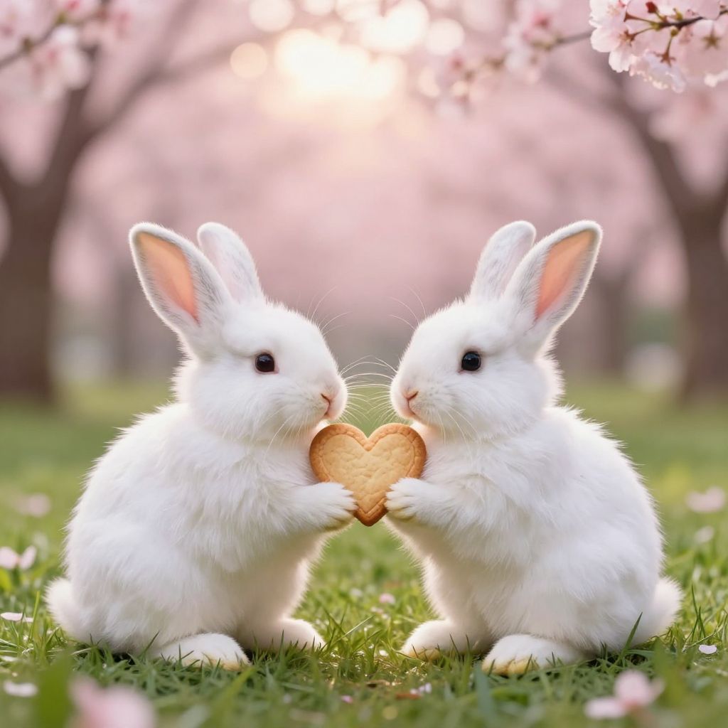 Two fluffy white rabbits sit face to face on green grass, holding a heart-shaped cookie between their paws. The background features soft pink cherry blossom trees and a warm, glowing light, creating a serene and romantic atmosphere.