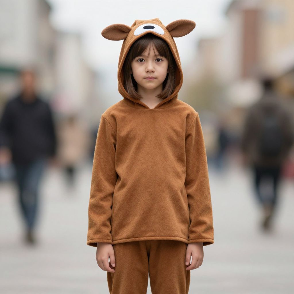 Kid shepherds costume, solo, 1girl, looking at viewer, brown hair, hood, blurry, long sleeves, pants, blurry background, standing, closed mouth, realistic, short hair