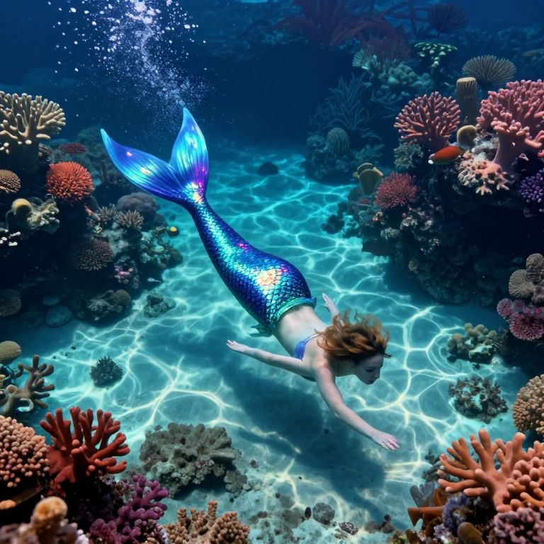 In a surreal digital art piece, depict an enchanting underwater scene with a mystical figure resembling a mermaid gracefully swimming among a kaleidoscope of vibrant coral reefs. The perspective is from within the intricate corals themselves, revealing delicate details of colorful fish and marine life in close proximity. As light filters through the water, it casts mesmerizing patterns on the reef, highlighting the ethereal creature's translucent skin adorned with an intricate network of glowing veins that pulse softly with her movements. This captivating image conveys a sense of wonder, serenity, and enchantment as the mysterious figure appears to exist harmoniously within this magical underwater realm.