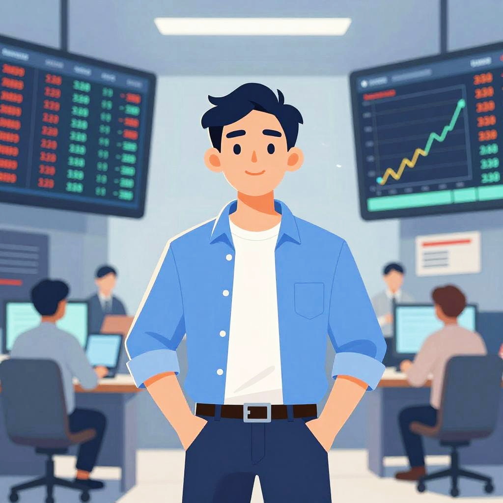 Boursier depicted as a confident trader in a busy trading floor, wearing smart casual attire, surrounded by large LED screens showing rising and falling stock prices, energetic mood, bright colors, stylized realism with emphasis on motion and data streams