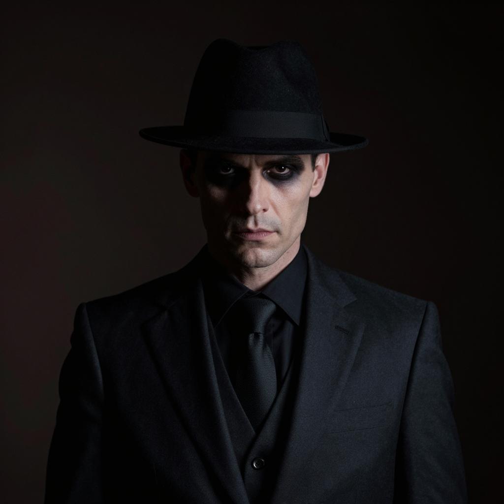 A man in a dark setting, wearing a black fedora and suit, with pale skin and a shadow over his right eye. He has a grim, slightly sinister expression. The background is mostly dark with a faint brownish light on the left. He is positioned in the center, facing slightly to the left.