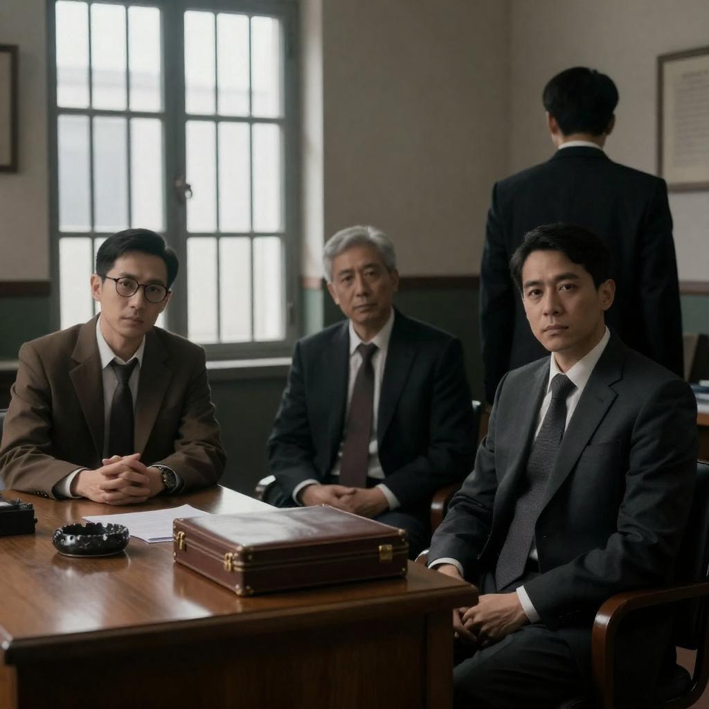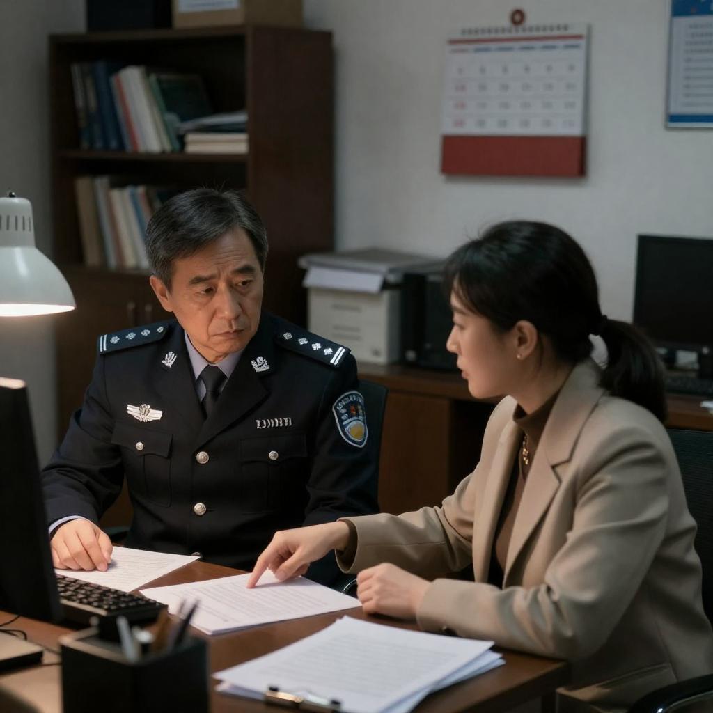 Photograph of two people in a dimly lit office. An older Asian man in a dark police uniform sits at a desk on the left, looking down with a tired expression. A middle-aged Asian woman in a beige coat sits at a desk on the right, pointing to a document with her right hand. Background includes a calendar, bookshelf, and office clutter. Desk lamps provide focused lighting.