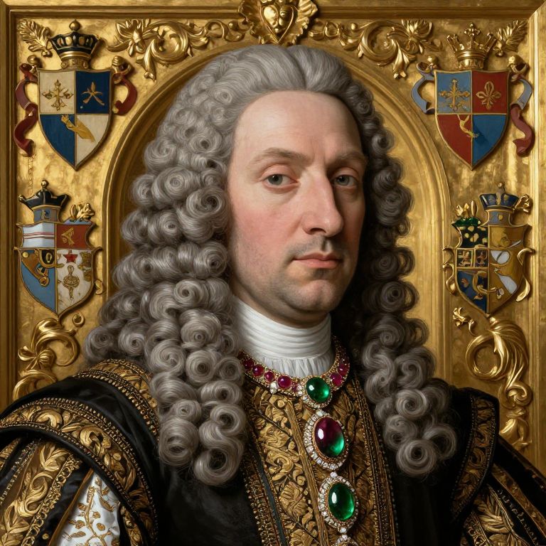 Put your face on a royal portrait, Renaissance era noble with embroidered brocade robes, emerald and ruby jewelry, powdered wig, solemn expression, ornate gilt background with heraldic symbols, highly detailed classical painting technique with textured brushstrokes.