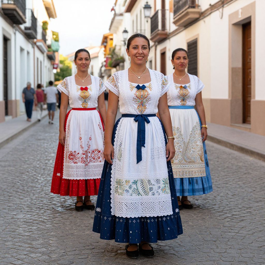 Photograph of three smiling women in traditional Spanish dresses with lace aprons, red, blue, and white skirts, standing on a cobblestone street