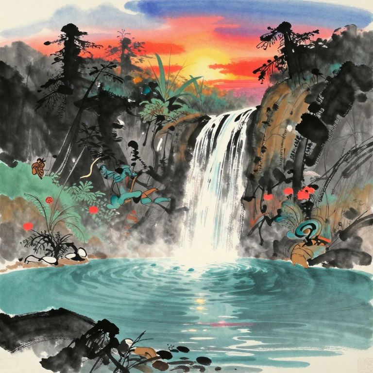Vibrant digital painting of a waterfall at sunset, featuring colorful birds, plants, and rocks, with a reflective turquoise pool below.