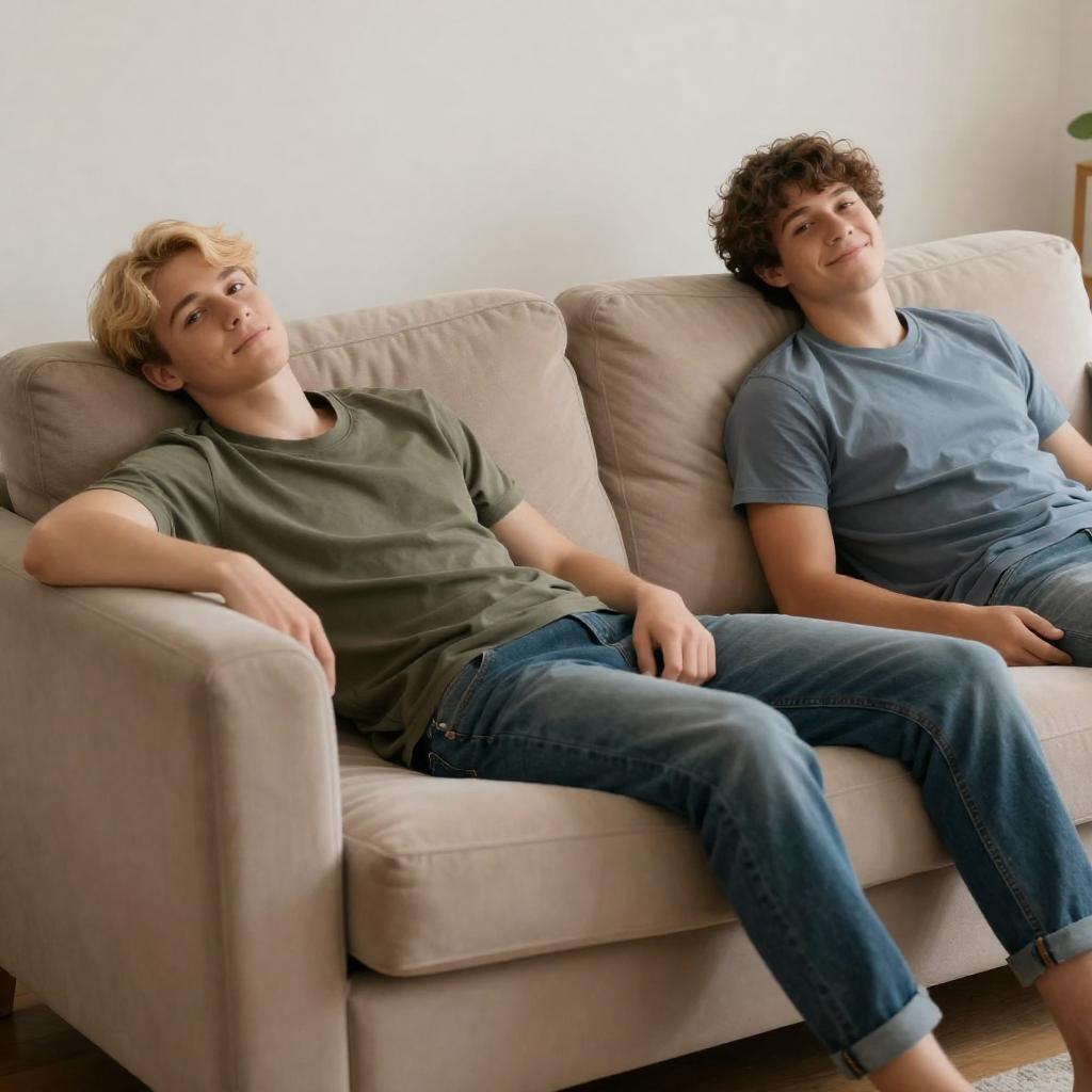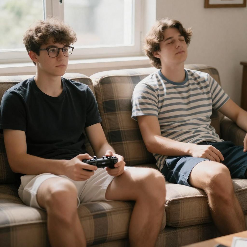 Photograph of two young men on a plaid couch. The left man, with short brown hair and glasses, wears a black shirt and white shorts, holding a game controller. The right man, with longer brown hair, wears a striped shirt and blue shorts, leaning back with his eyes closed. Bright sunlight streams through a window behind them.