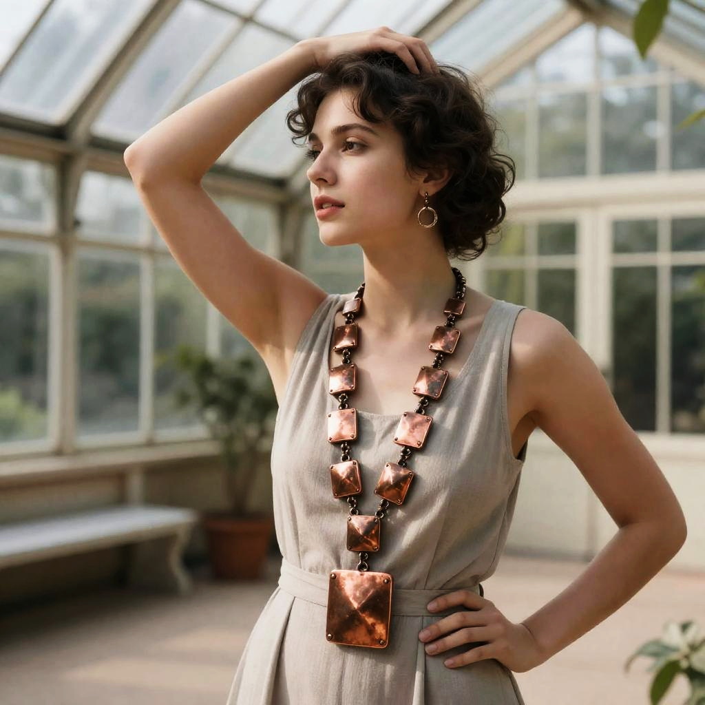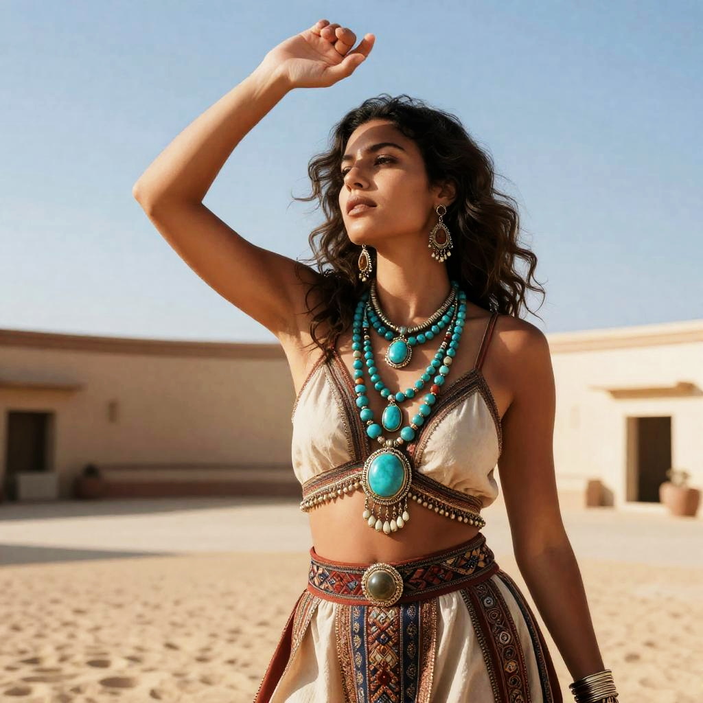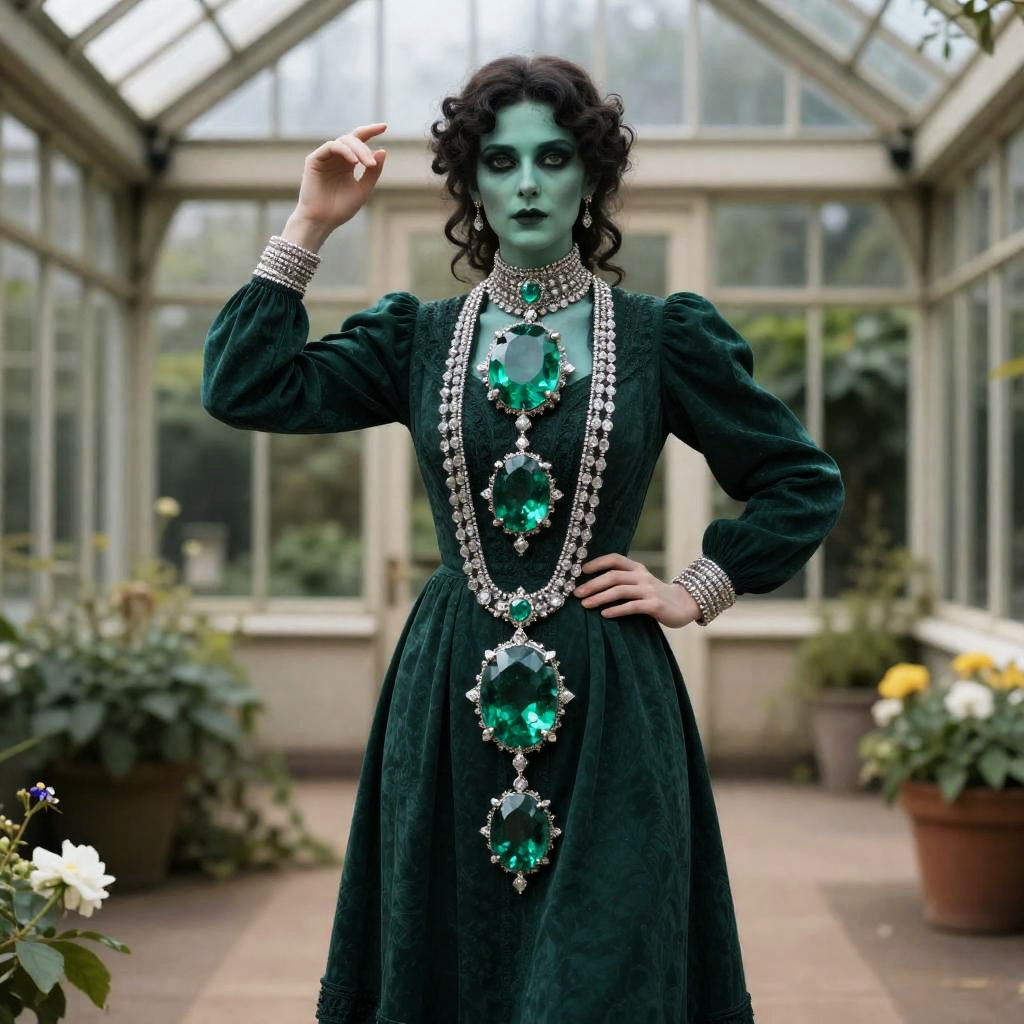 Quirky artist in neon green chunky jewelry, striking a pose in a colorful art festival