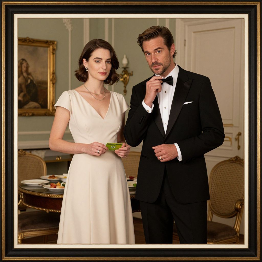 Elegant couple standing in a vintage-style room, the woman in a cream dress holding a green card, while the man in a black tuxedo gestures thoughtfully, framed by a gold-and-black border.