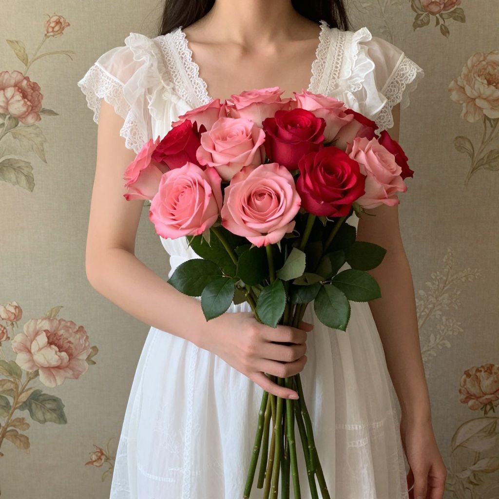 Photograph of a woman from the shoulders down, wearing a white lace-trimmed sleeveless dress, holding a bouquet of mixed red and pink roses. Her skin is fair, and she has long, dark brown hair. The background features a floral wallpaper with soft pink and green flowers. The woman's left hand gently grips the stems, while her right arm rests by her side. The roses are fresh, with lush green leaves. The image has a soft, vintage feel, enhanced by the delicate lace and floral patterns.