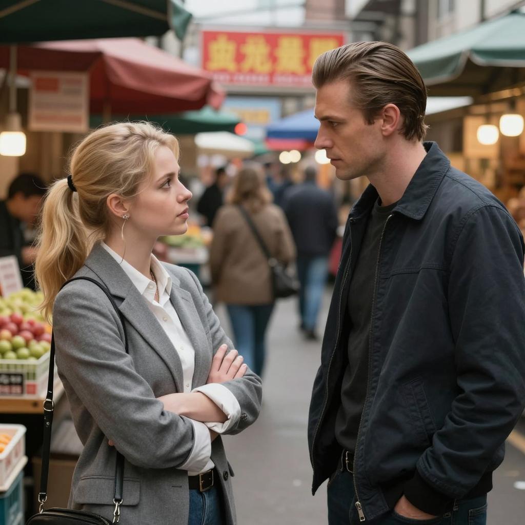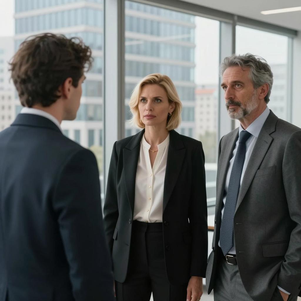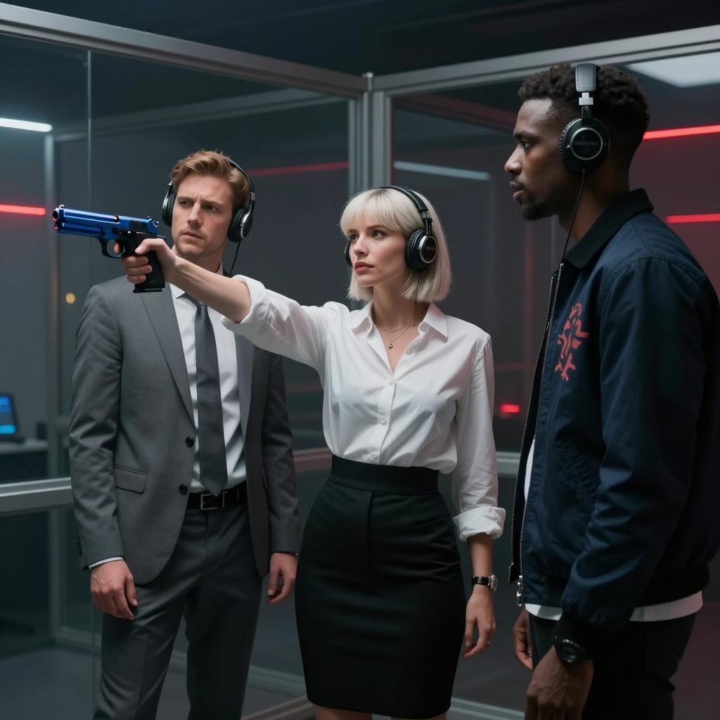 Three people in a dimly lit room with glass panels. A white woman with short platinum blonde hair, wearing a white blouse and black high-waisted skirt, points a blue gun while wearing headphones. A white man in a gray suit and tie looks at her with concern. A black man in a dark jacket with a graphic design on the shoulder wears headphones, looking towards the woman. Red laser light in the background.