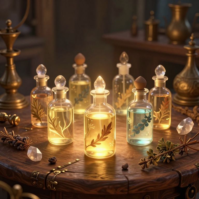 Medicinal potion bottles arranged on an ancient wooden table, glowing with magical light, surrounded by dried herbs and crystals, alchemist's workshop background, warm tones, fantasy illustration with intricate details and textures.
