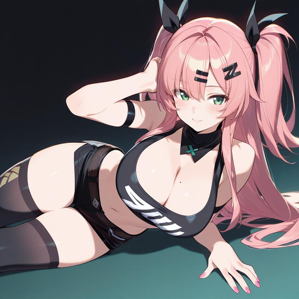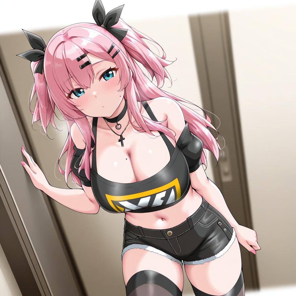 Amillion (zenless zone zero), zenless zone zero, 1girl, green eyes, mole under eye, pink hair, long hair, two side up, hair ribbon, hairclip, large breasts, mole on breast, cleavage, thighs, navel, black thighhighs, black shorts, black ribbon, bare shoulders, nail polish, pink nails, crop top, midriff, by artist makaroll, illustrious