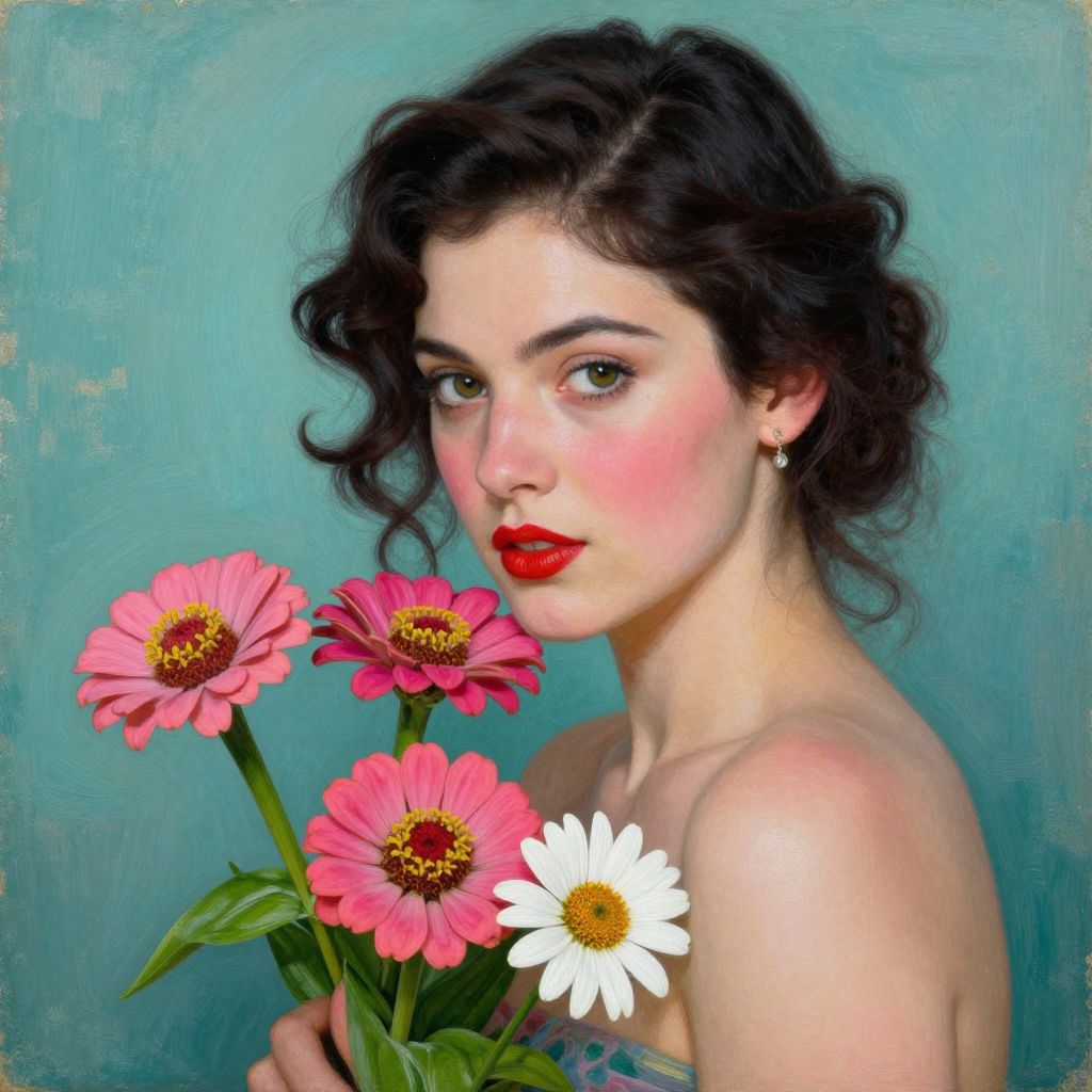 Digital painting of a fair-skinned woman with wavy dark hair, red lipstick, holding pink and white daisies, against a teal background.