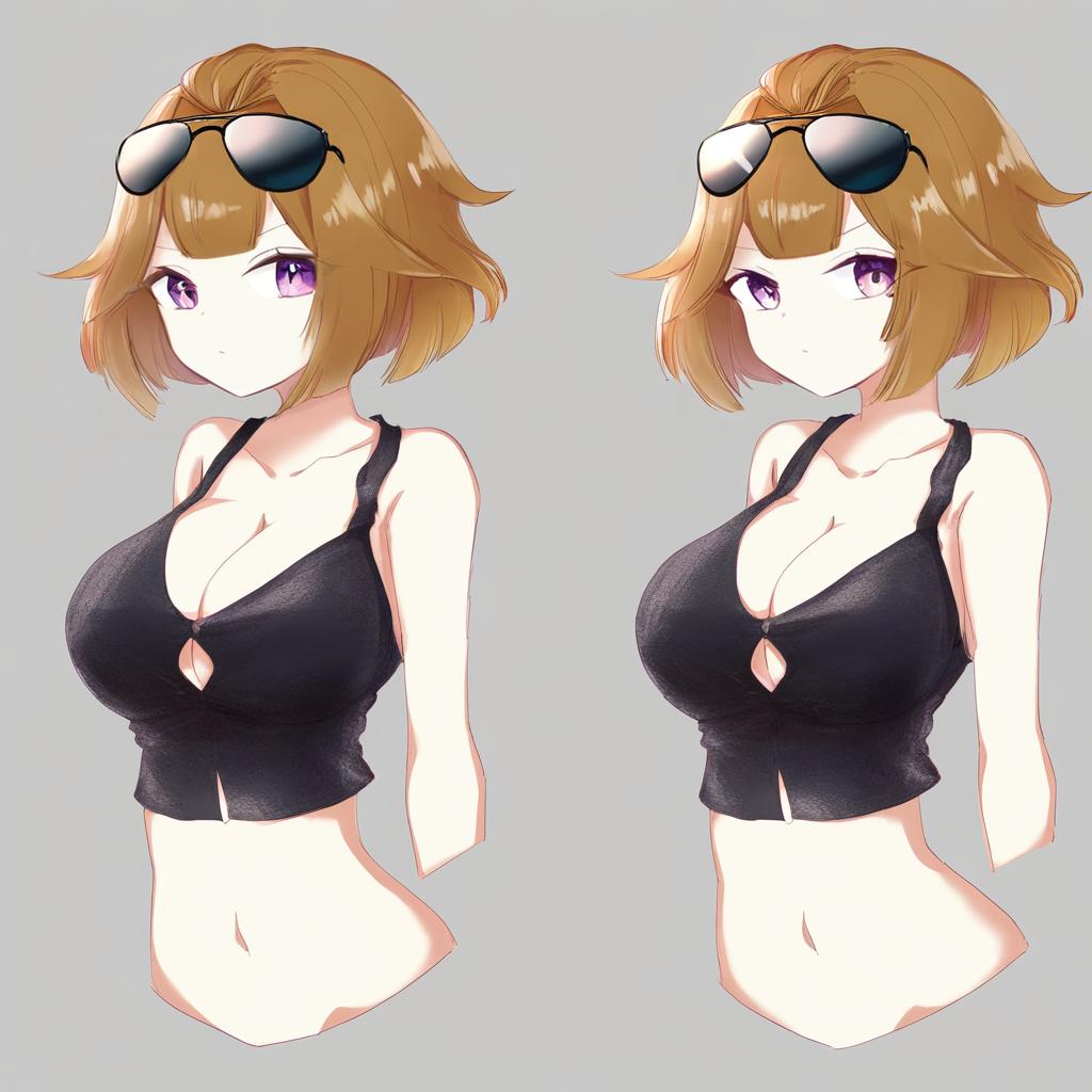 Grizzly mkv (girls' frontline), girls' frontline, 1girl, purple eyes, eyewear on head, brown hair, short hair, large breasts, cleavage, navel, sunglasses, by artist hanada hyou, leet