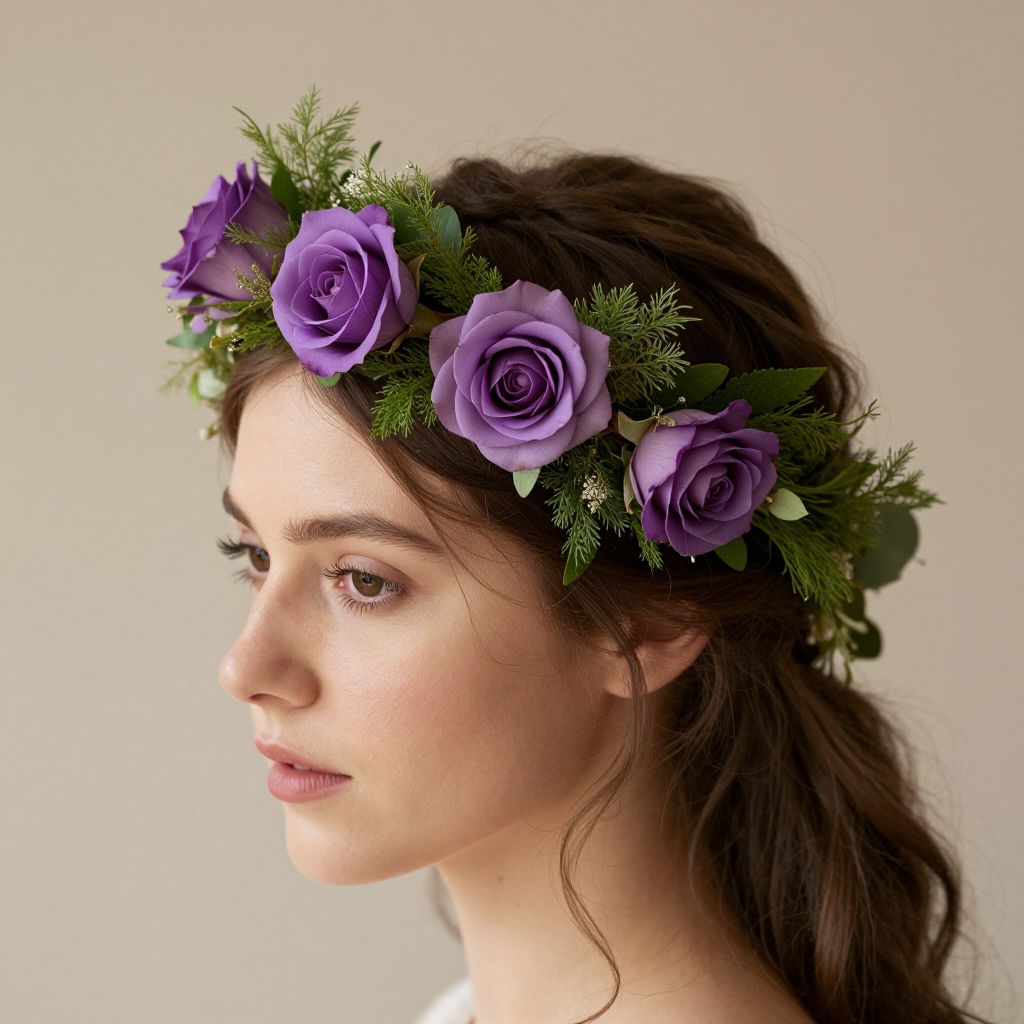 Woman wearing a delicate purple flower crown featuring three vibrant purple roses and lush green foliage, styled as a bridal halo for a rustic wedding, showcasing elegant bridal hair accessories by FETE DE FLEURS.