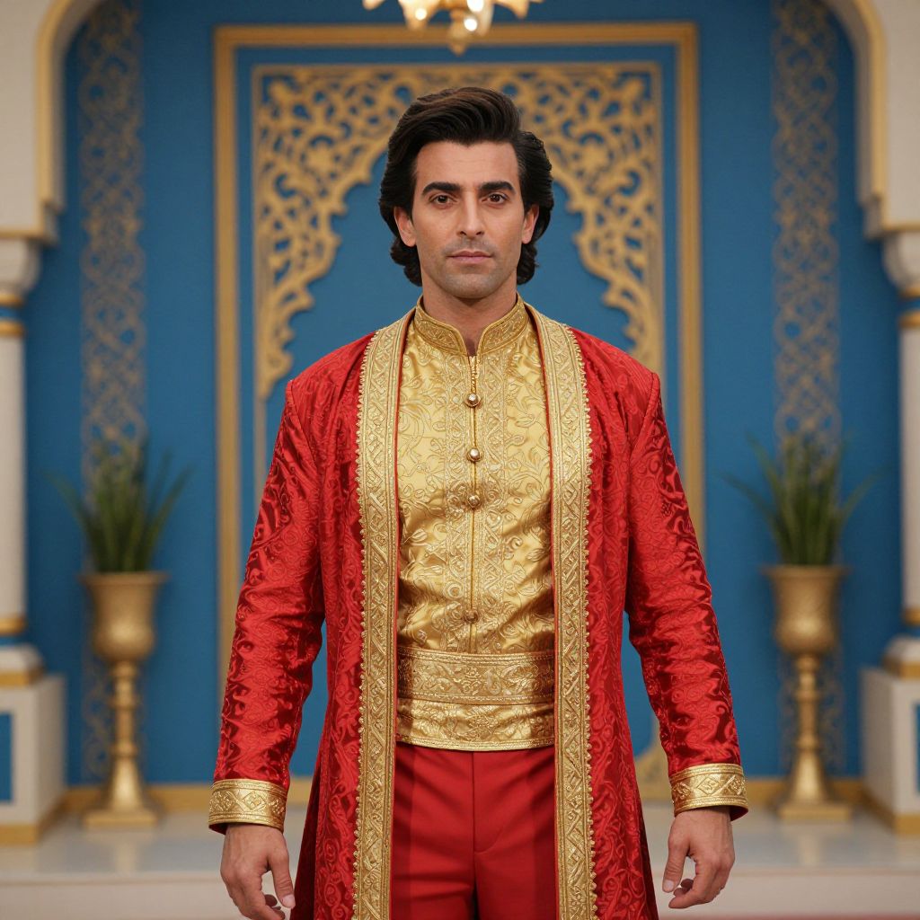 Photograph of a handsome man with dark hair, wearing an ornate red and gold traditional outfit, standing in an opulent blue and gold decorated room