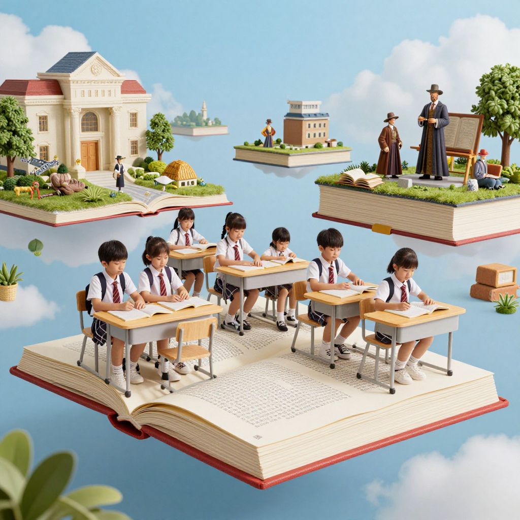 Schoolchildren in a floating classroom ride giant, levitating textbooks through chapters brought to life as shifting landscapes and historical figures.