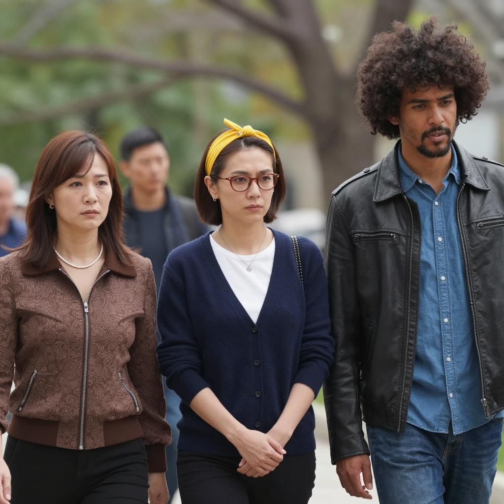 Photograph of three people walking outdoors. The woman on the left has shoulder-length brown hair, brown patterned jacket, white necklace. The middle woman has short brown hair, yellow headband, glasses, navy cardigan, clasped hands. The man on the right has tall, curly black Afro, black leather jacket, blue shirt. Background includes trees, park, and other people. The middle woman looks serious, the man looks slightly downward, the woman on the left has a neutral expression.